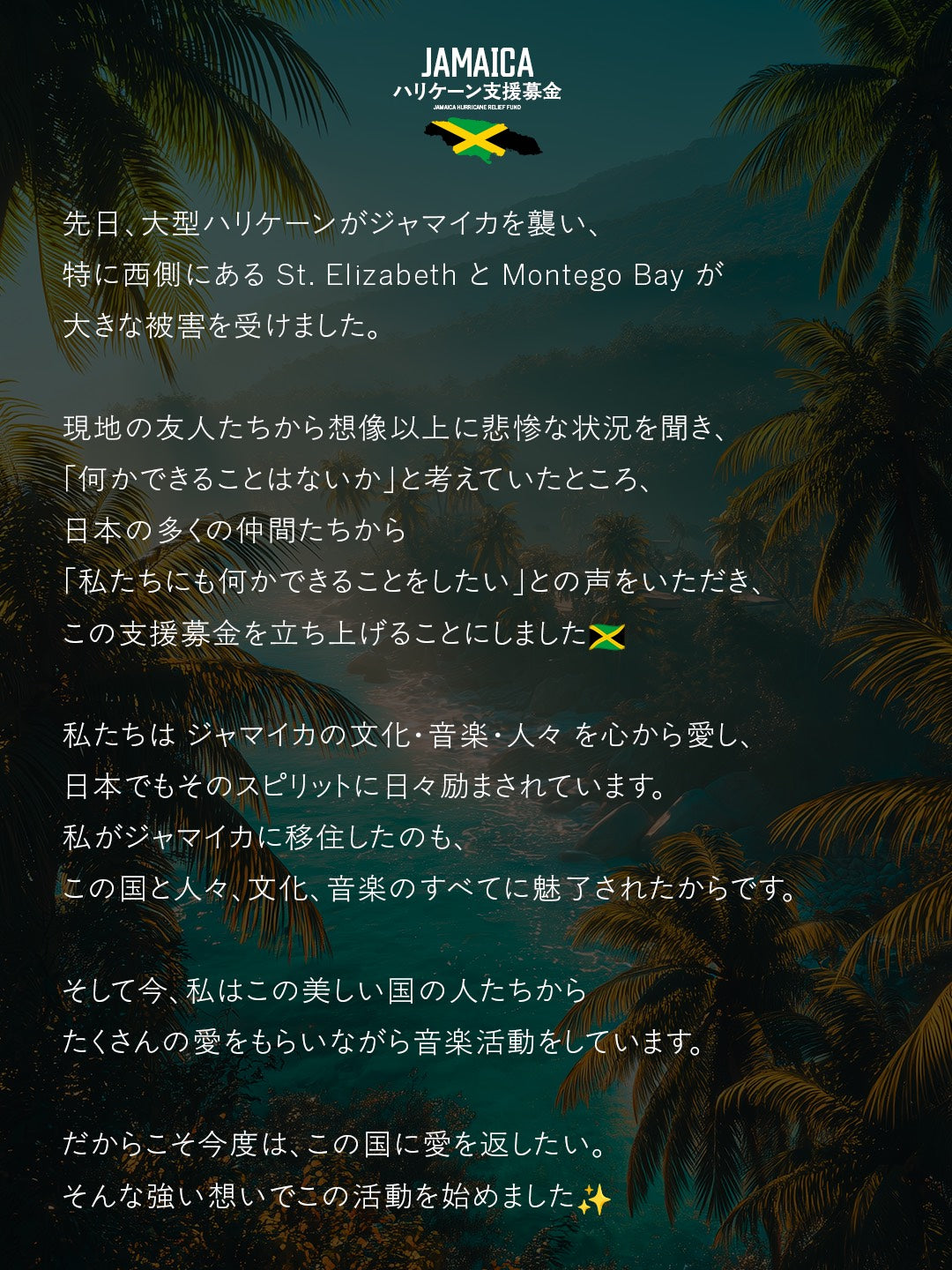 受けた方々のために、救援物資を届けてくださる「JAMAICAハリケーン支援募金」へ、売上の10%を支援としてお渡ししています。